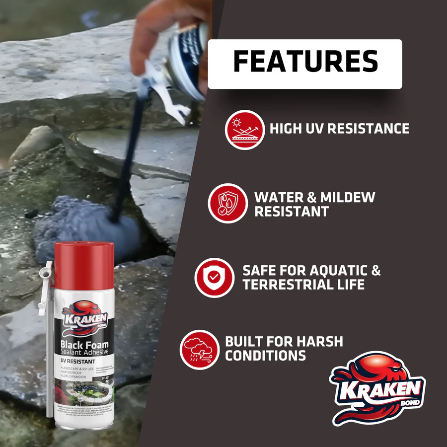 Black Foam Waterfall Landscape Adhesive Sealant is specifically engineered for demanding outdoor and landscape environments, providing a discreet black finish that blends seamlessly with natural surroundings. This premium polyurethane, ideal waterfall foam offers exceptional insulation and sealing capabilities, even in low temperatures, making it perfect for year-round applications.