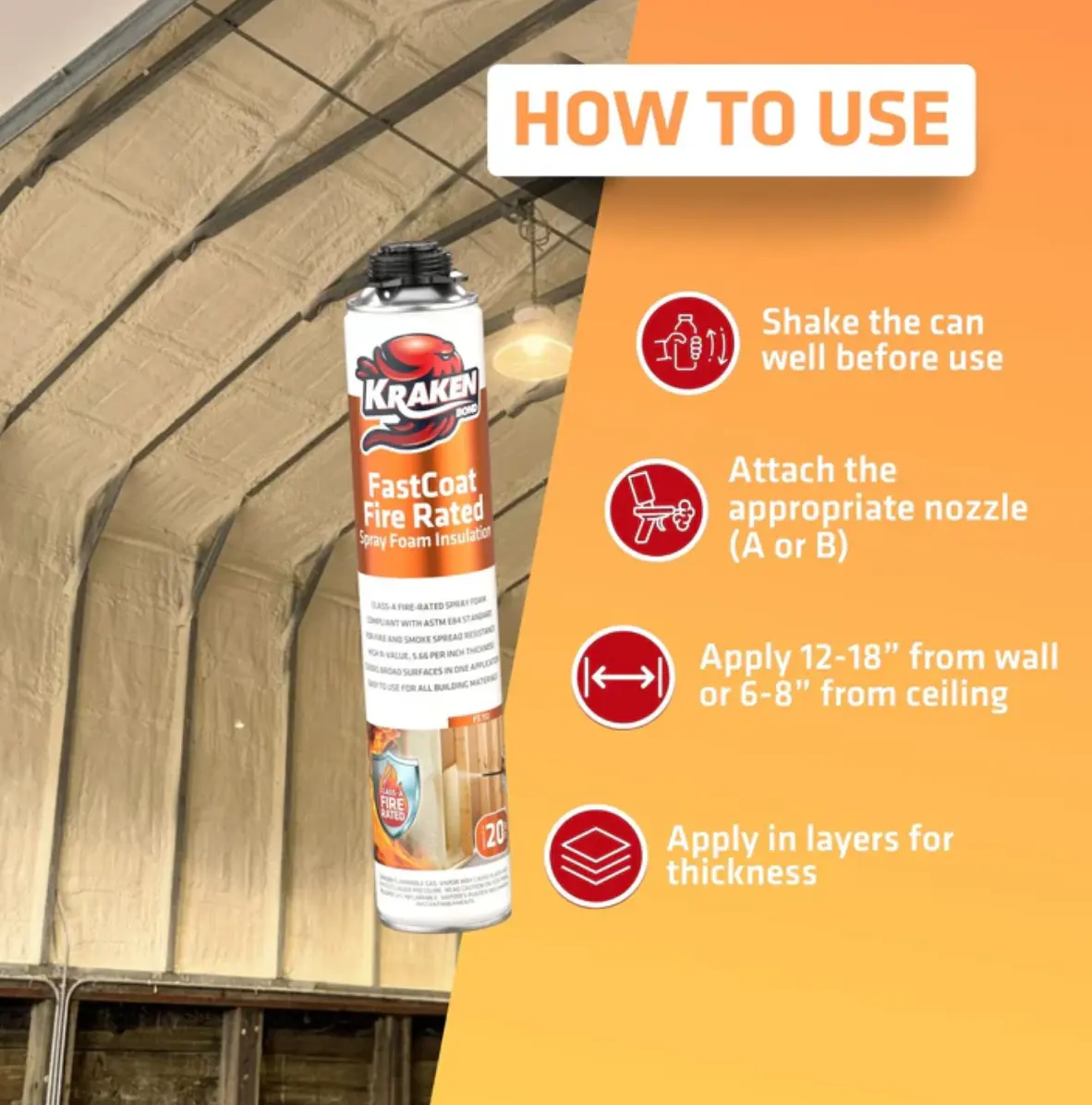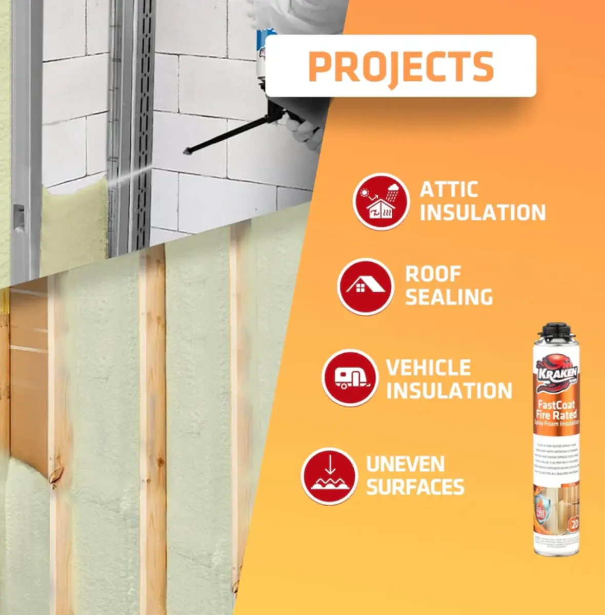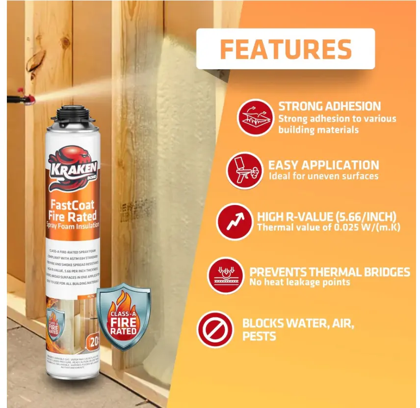 • Class-A Fire-Rated Spray Foam: Complies with ASTM E84 standards for fire and smoke spread resistance, improving building safety.