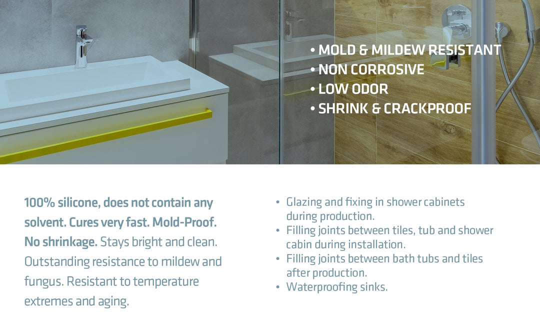 Kitchen & Bath Silicone White/Clear is polymer-based silicone that provides strong bond and initial tack. It can glue construction materials without the need of clamps and tapes.