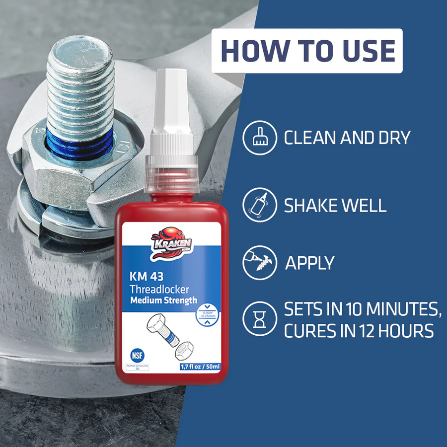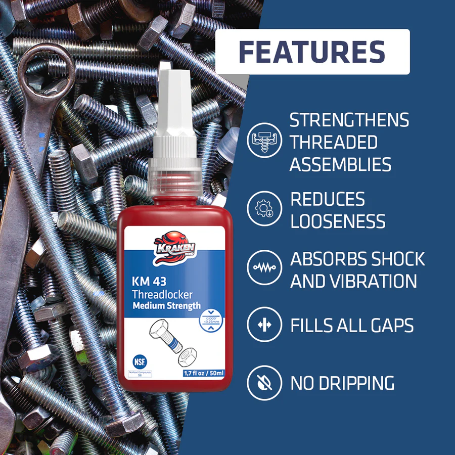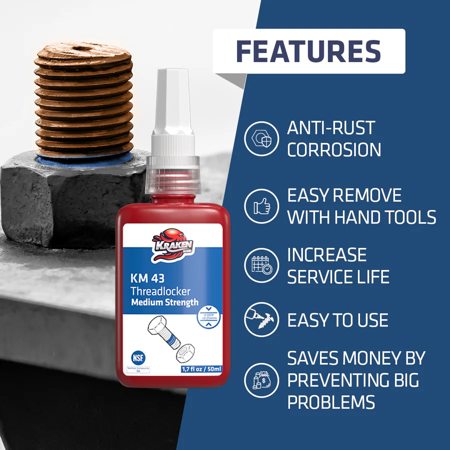 The Medium Strength Blue Threadlocker provides secure fastening, preventing bolts and nuts from loosening due to vibration or leakage. Its oil-tolerant formula ensures optimal performance even on slightly oily surfaces. Designed for long-term protection, this blue threadlocker protects metal parts against corrosion. As an NSF Registered Heavy-Duty Sealant, it contains no solvent, seals immediately, and prevents corrosion, seizing, and galling, ensuring the durability of fasteners. Certified to NSF/ANSI 61-G, it meets safety standards for various industrial applications.