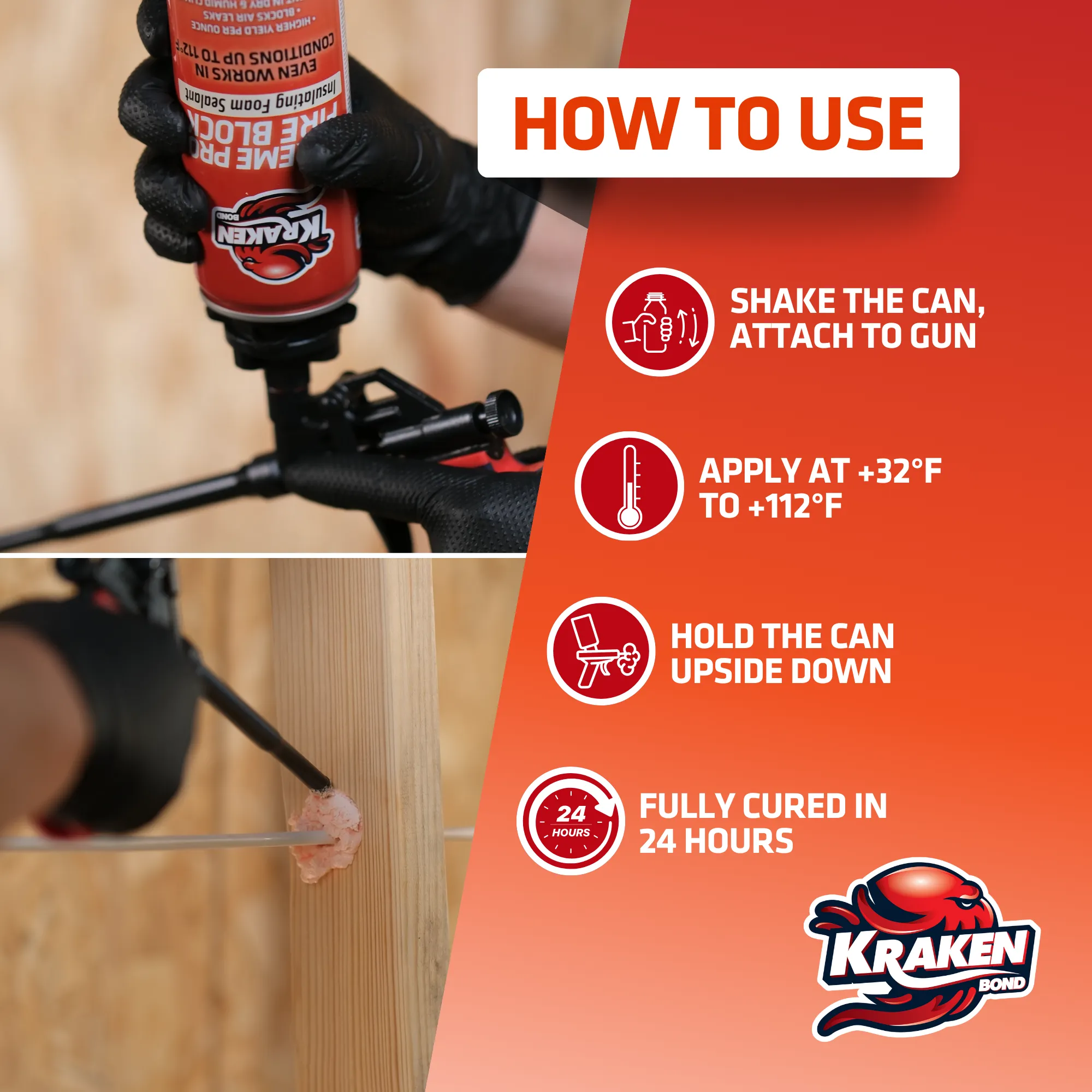 • Shake the can well before use. Screw the can onto an applicator gun. The output of the foam can be regulated with the trigger and controlled with the adjustment screw on the back side of the gun.