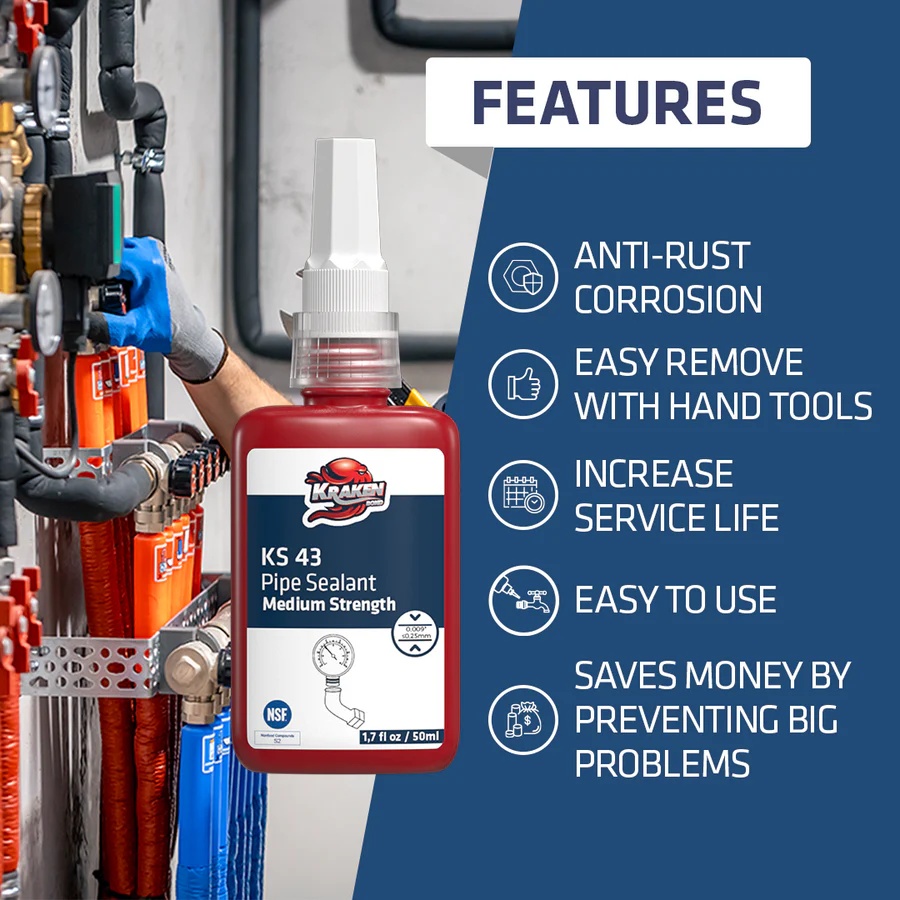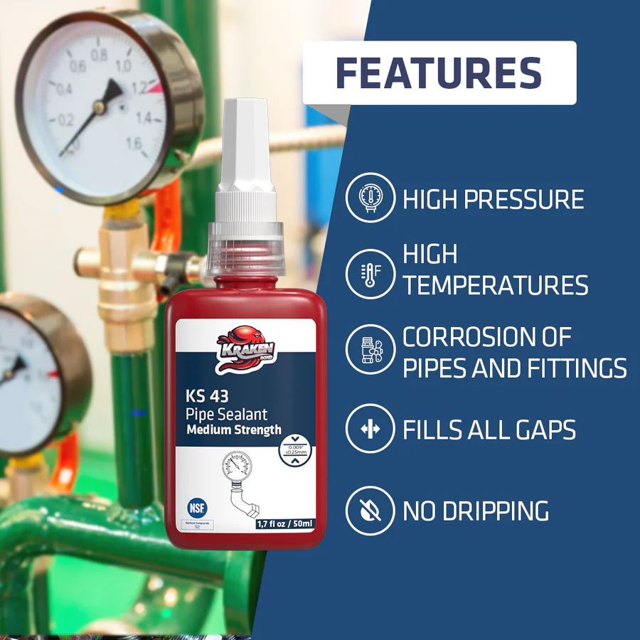 The Medium Strength Pipe Thread Sealant KS 43 provides secure, leak-tight joints for threaded pipes in plumbing, industrial, and automotive systems. Its thixotropic formula minimizes product migration, ensuring precise application even in high-pressure and oil-resistant environments. Resistant to extreme temperatures, KS 43 offers easy removal, making it a reliable choice for both professionals and DIY users.