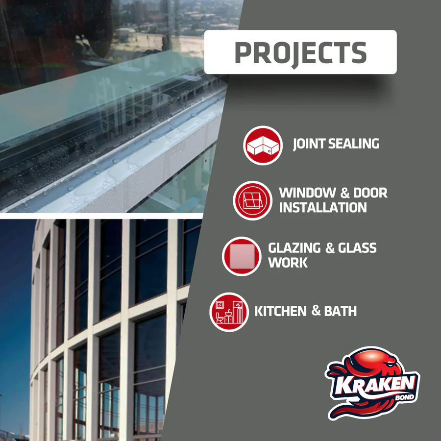 • Sealing of connection points of brick, wall, concrete, PVC, wood, glass.