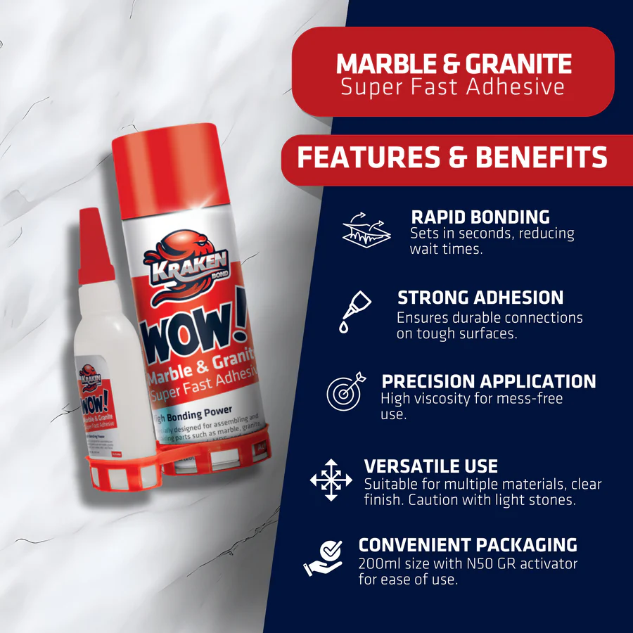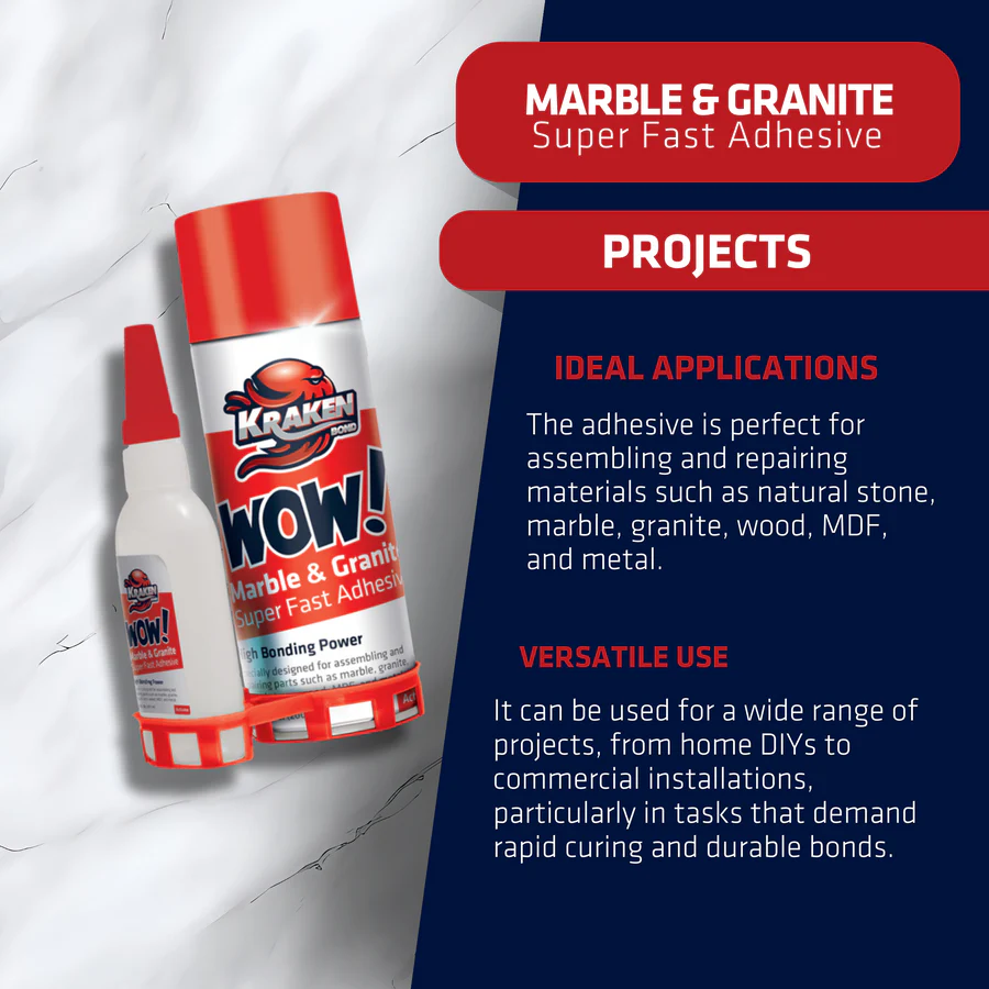 The solution for professional-grade repairs and installations, Wow Marble & Granite Super Glue unleashes the ultimate bonding power. Engineered with precision for the most demanding tasks, the Marble & Granite Adhesive sets the standard for strength, speed, and versatility in the world of adhesives.